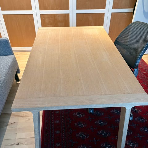 Spisebord i massiv sæbebehandlet bøg med 2 plader. Pladerne lægger nede i bordet.