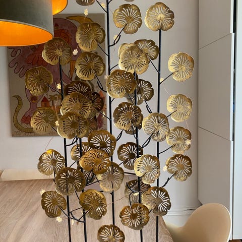 &Tradition vægdekoration i metal med bladformede elementer i gyldne og blå nuancer. Dekorationen er udført i buede metalstænger med påsatte metalblade i forskellige størrelser. Målebillederne viser en bredde på ca. 80 cm og en højde på ca. 45 cm. Velegnet som vægpynt til indendørs brug ved andre højtider eller som generel boligdekoration.