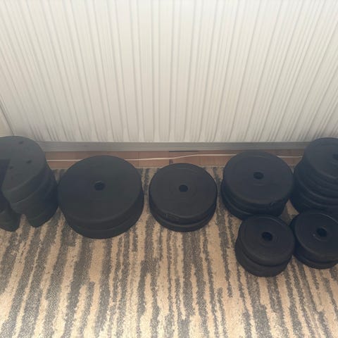 Alle skiver er i brugt men god stand med almindelige brugsspor. Perfekt til homegym, styrketræning og seriøs træning.