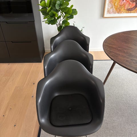 Originale og superfine Eames Plastic Armchair (DAR), sort / krom fra Vitra Designet. Hynder kan medfølge. Siddehøjde 43 cm.