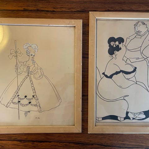2 indrammede dekorative Bjørn Wiinblad litografiske tryk med signatur, noter og kostumeudkast til balletter (Gryden og Skralden). 65x45 cm. Sælges samlet. Købt i 1975.
