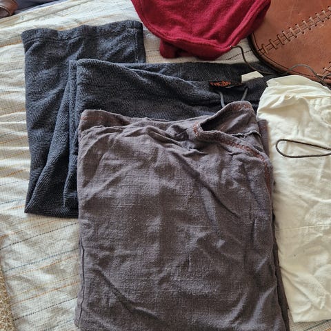 Rollespil rustningssæt bestående af brystplade, bælte/hoftestykke og skumsværd. Til barn på ca 8-12 år. Brystpladen er i grønligt lædder med brune læderremme og spænder til justering. Bæltet/hoftestykket er i sort tekstil med brune læderdetaljer og snøringer, med holder til sværdet. Sværdet er udført i skum med gråt blad og brun håndtagstape, egnet til rollespil og udklædning.