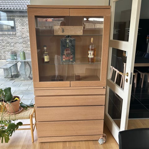 Stor flot vitrine fra Skovby. Der er lys i selve hylderne. 1 låge hvor der gemmer sig hylder bag og 4 skuffer. Kan deles i 2 dele. Fra ikke ryger hjem. Se anden annonce med en skænk fra Skovby. Købes begge dele, gives der rabat