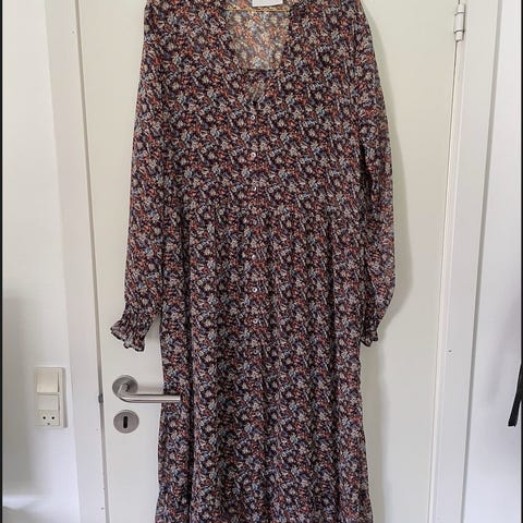 Lollys Laundry hverdagskjole til dame i størrelse XL. Kjolen er fremstillet i viskose og har et multifarvet blomstermønster på mørk bund. Modellen har lange ærmer og længde til under knæet. Velegnet som hverdagskjole.