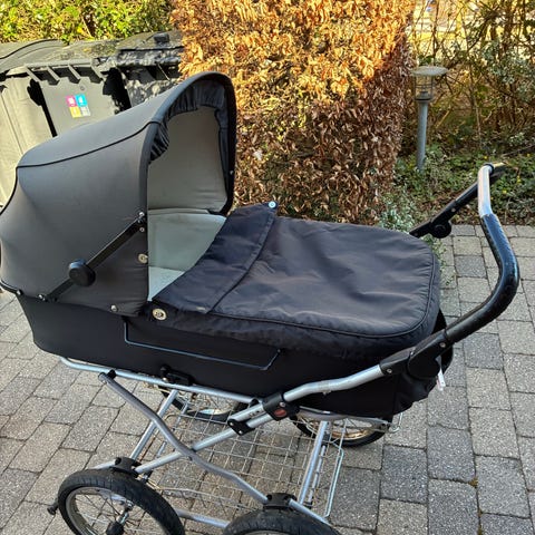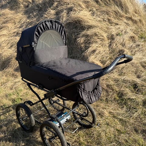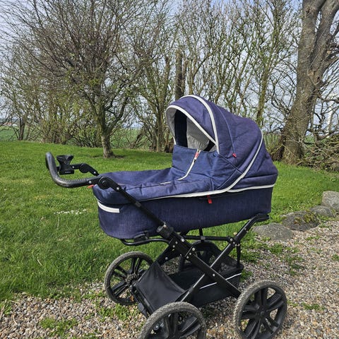 Stor Odder barnevogn. Indvendige mål er: L=95 cm, B=39cm og højde fra bund til kaleche er 66cm. Vognen kører som en drøm (dejlige store hjul) og er noget nemmere at komme rundt med end de mindre nye modeller. Den har stået under halvtag/i skur men har diverse synlige skavanker (rust og manglende knap), som dog ikke har nogen indflydelse på hverken sikkerhed eller funktion. Overdelen kan slås sammen, håndtag kan reguleres i højde og inderstof kan tages af og vaskes. Der er lommer på begge sider udvendigt og 2 små flaskelommer i inderstoffet. Der er en solid trådkurv under vognen. Vognen blev i sin tid købt hos Jalsø på Roskildevej. Den er ikke jordslået og ikke falmet i farven.