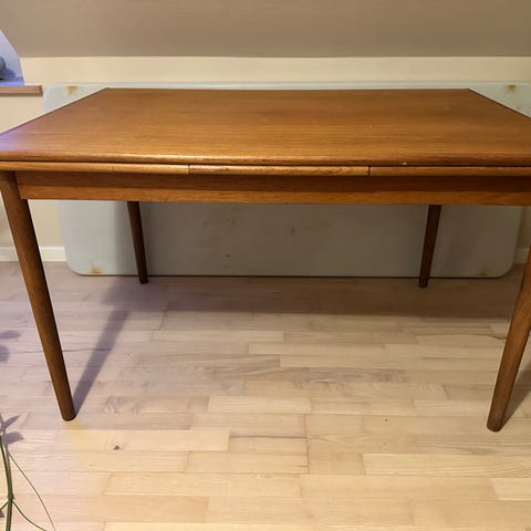 Spisebord med Hollandsk Udtræ af teaktræ i flot stand men brugt.