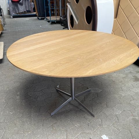 Rundt / cirkulær spisebord i massivt egetræ med 1 stk stor tillægsplade.