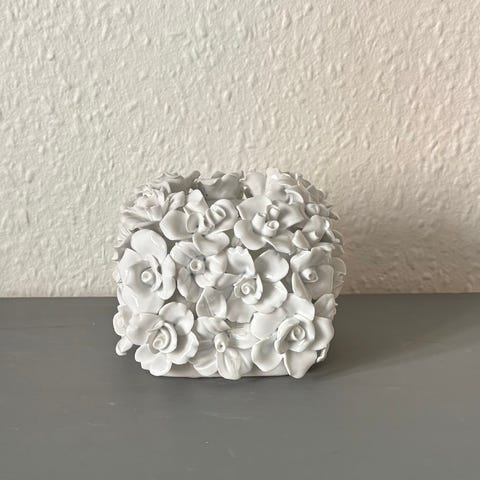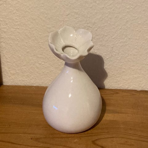 Smuk hvidglaseret porcelænsvase formet som en blomst. Pæn brugt stand. Mål: ca 14 x 14 x 4,5 cm. Kr 129,-