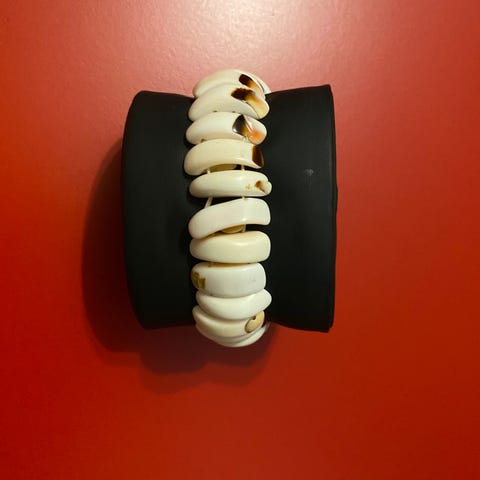 Er lavet af strandskaller og robust elastik. Er købt hos en guldsmed i Rønde på Djursland.