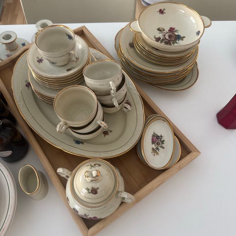 Kaffestellet består af 12 kopper, underkopper, sidetallerkener, flødekande, sukkerskål samt 3 fade i forskellig størrelse og form.