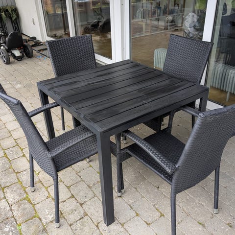 Havebord med 4 matchende stole i sort. Bordet er i vedligeholdelsesfrit materiale. Stolene hedder Ilderhuse og er i sort flet med metalstel. Sættet er egnet til udendørs brug på terrasse eller altan og giver siddepladser til fire personer.