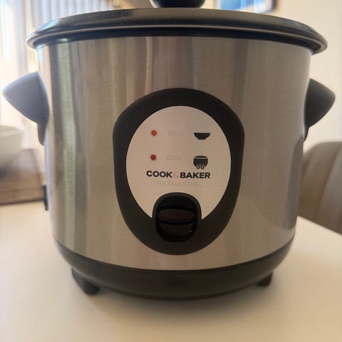 Cook & Baker riskoger i hvid. Elektrisk riskoger med aftagelig indergryde med non-stick belægning. Låget er i glas med plastkant. På fronten er der betjeningspanel med indikatorlamper og tænd/sluk-knap. Medfølgende tilbehør omfatter målebæger, ris-ske og strømledning. Velegnet til tilberedning af ris og lignende retter i køkkenet.