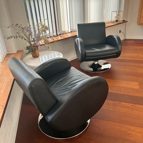 Lænestole polstret grå med sorte ben, stel i sortlakeret stål.