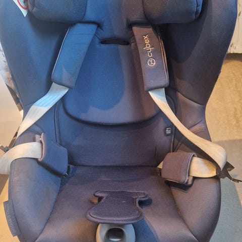 Cybex autostol i størrelse 18. Autostolen har integreret 5-punktssele og justerbar hovedstøtte. Den monteres på en base, som er fastgjort til sædet. Betrækket er i en mørk farve med lyse seler. Velegnet til brug i bil til børn,