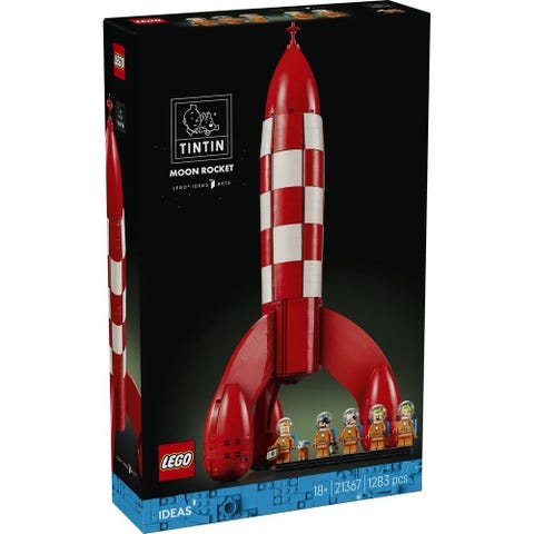 LEGO Ideas Tintin Moon Rocket byggesæt. Sættet indeholder en rød og hvid raket samt flere minifigurer i rumdragter. Byggesættet er egnet til LEGO-samlere og fans af Tintin-universet, og kan bruges både som lege- og udstillingsmodel.