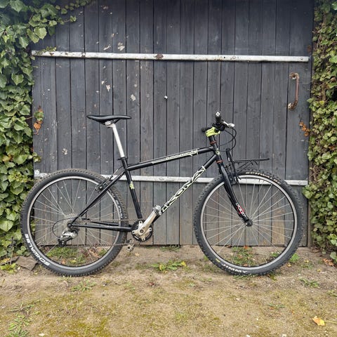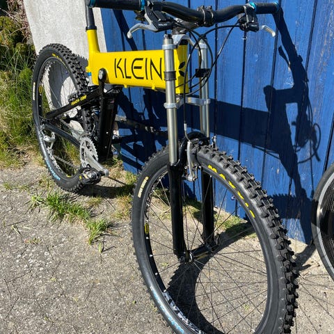 KLEIN fuldaffjedret alu-mtb fra 90’erne med 3x8-speed Shimano XT gear og bremser. Sjældne NOS Mavic CROSSMAX SUP CERAMIC hjul med keramiske bremseflader og selvfølgelig de korrekte bremseklodser i XT-bremserne. NOS 26x2,5” MAXXIS wetscream SUPER TACKY ST downhill-dæk. Ny 8-speed Shimano 11-32 kassette og kæde - dog ikke Shimano XT. Nyere carbon sadel, sadelpind, styr og frempind. Cyklen er monteret med dobbeltkronet forgaffel samt den originale FOX VANILLA bagdæmper - begge dele meget velfungerende. Shimano SPD pedalerne kan evt. skiftes til “flats” hvis man ønsker det. Rammen har været brugt lidt gennem årene med andre dele, men cyklen har ikke været kørt på siden blev opgraderet med XT delene og alle de ubrugte carbondele og NOS-dele for ca. 5 år siden. Cyklen passer nok bedst til personer på 180-190cm.