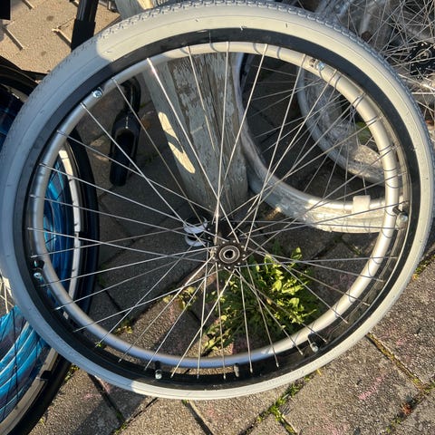 Wheelchhairs tires på 24 tommer of 20 tommer med sølvfarvet fælg og eger. Hjulet er monteret med dæk, som på siden er markeret med størrelsen 24 x 1 3/8 (37-540). Velegnet som reservedel eller udskiftning på wheelchairs, der bruger denne hjul- og dæktype.