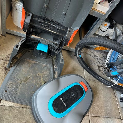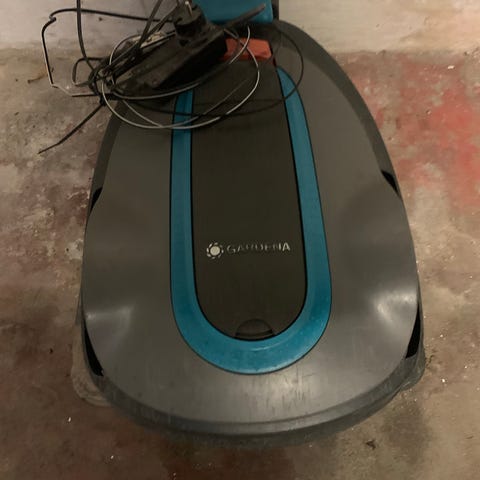 Gardena robotplæneklipper i grå og blå. Enheden står på ladestationen på billederne. Egnet til automatisk klipning af græsplæne. Strømforsyning sker via indbygget batteri, som oplades i ladestationen. Yderligere specifikationer som klippeareal, modelbetegnelse og funktioner fremgår ikke af billederne.