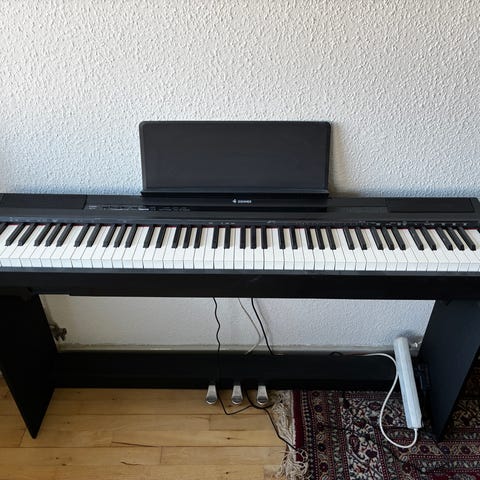 Maxi Musik KB 2 keyboard med fuldt klaviatur i standardstørrelse. Elektronisk keyboard med flere funktioner og indstillinger, som kan styres via kontrolpanelet over tangenterne. Egnet til øvning og indlæring af klaverspil, for eksempel sammen med nodebøger som vist på billederne. Sort kabinet med hvide og sorte tangenter i klassisk layout