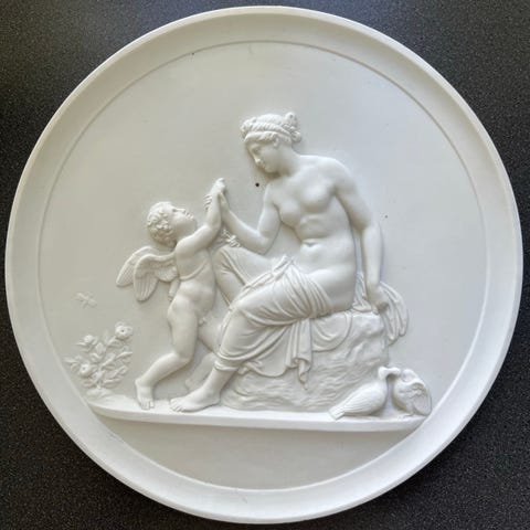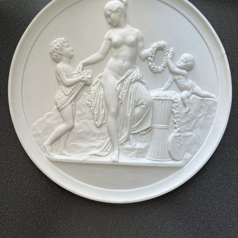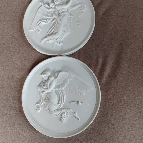 Antikke bisquitplatter (uglaseret hvidt porcelæn) med motiverne "Dagen" og "Natten", skabt af den danske billedhugger Bertel Thorvaldsen.