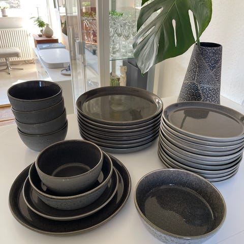 BITZ tallerkener i stentøj i grå nuance. Tallerkenerne har en rund form med let opadbuet kant. Egner sig til servering af hverdagens måltider såvel som til borddækning ved gæster. Kan typisk bruges både til middagstallerkener og anretning af mindre retter, afhængigt af størrelsen. Stand se billeder. Det