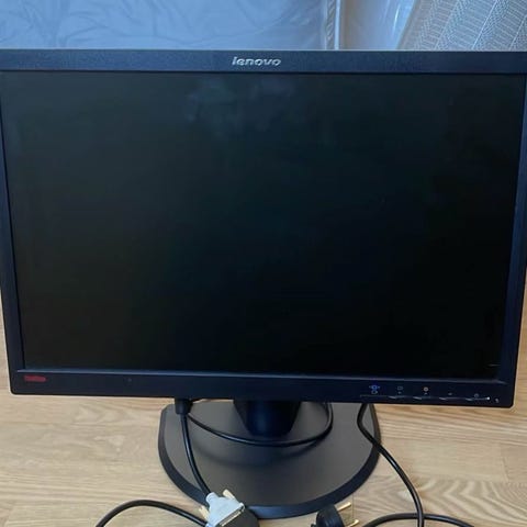 Byd gerne - Lenovo skærm på 24" i sort. Skærmen har indbyggede USB-porte i siden. Bagpå ses tilslutningsmuligheder til blandt andet DVI samt strømtilslutning. Velegnet som ekstern skærm til stationær eller bærbar computer på kontor eller hjemme arbejdsplads. Leveres med strømkabel og videokabel som vist på billederne.