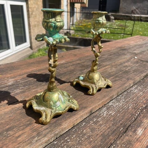 Flotteste sæt antikke lysestager i en god størrelse. Passer til kronelys og klar til at pryde din vindueskarm.
