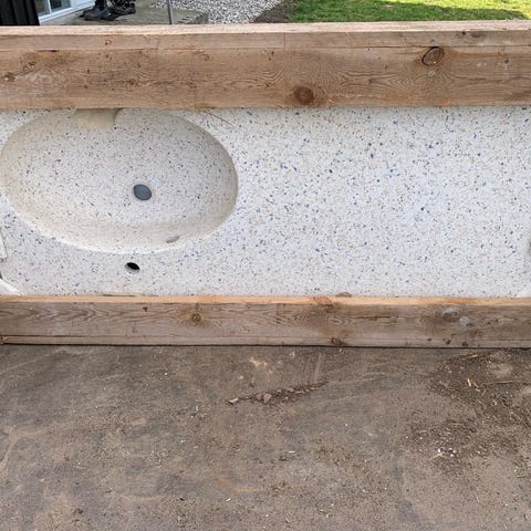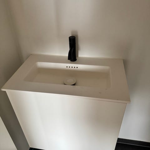 Håndvask med bordplade og armatur grå stål