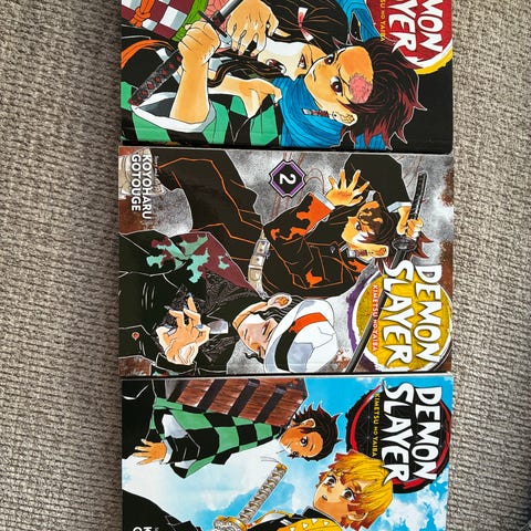 Sælger 18 af demon slayer manga serie på engelsk, sælges kun samlet. Nogen af bøgerne har fået sol udenpå, men fejler intet indeni. Prisen er fast. Helst kun seriøse henvendelse☺️