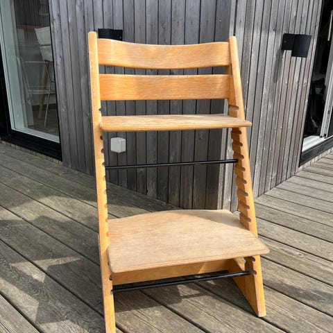 Stokke Tripp Trapp højstol i træ. Klassisk børnestol med justerbar siddeplade og fodplade, der kan tilpasses barnets højde. Stolen er udført i træ med naturfinish og er egnet til brug ved spisebord eller som siddeplads til børn i forskellige aldre, afhængigt af montering og indstilling af pladerne. Bemærk at det er den gamle model og uden bøjle. Den har tydelige brugsspor, men fejler ikke noget.