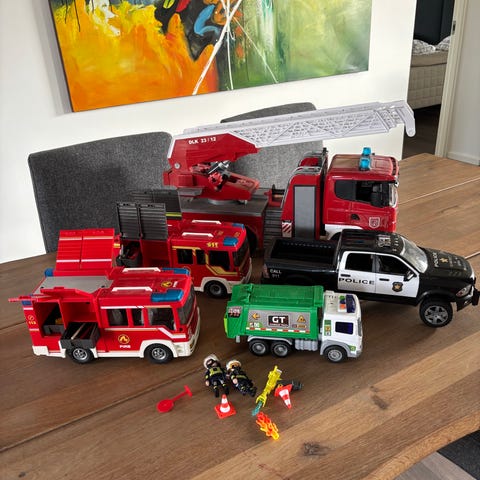 Playmobil brandstation med brandbil og helikopter. Sættet består af en brandstation, hvor der er kontrolrum og sovepladser, brandbil med udstyr, redningshelikopter, samt figurer.
