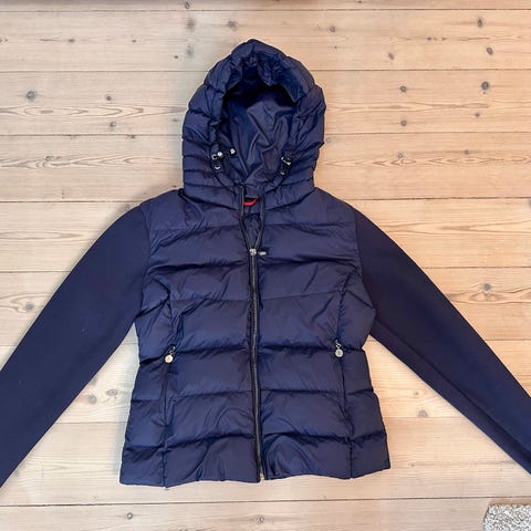 Moncler dunjakke i størrelse 1, men stilen er oversized. Jakken er rød og fyldt med dun, hvilket giver en voluminøs og isolerende pasform. Klassisk quiltet design med høj krave og trykknaplukning foran. Moncler-logo på ærmet og karakteristisk inderlabel med tegneseriestribe. Den har brugsspor, og sælges derfor til lavere pris. (På Etsy sælges en tilsvarende, rød vintage jakke til 3300 kr).