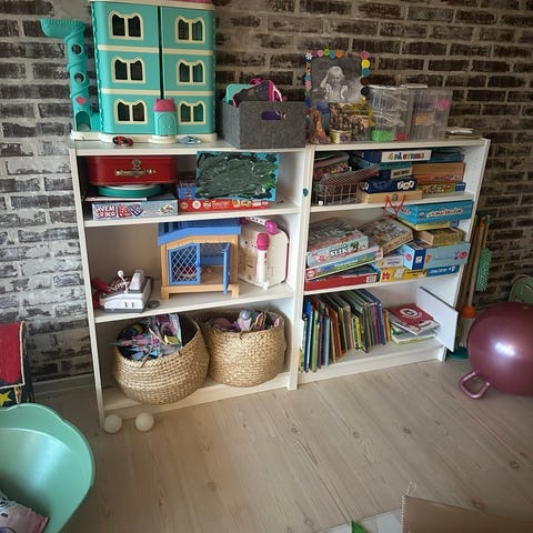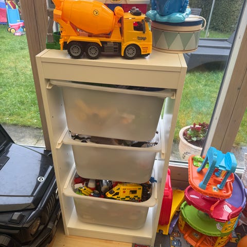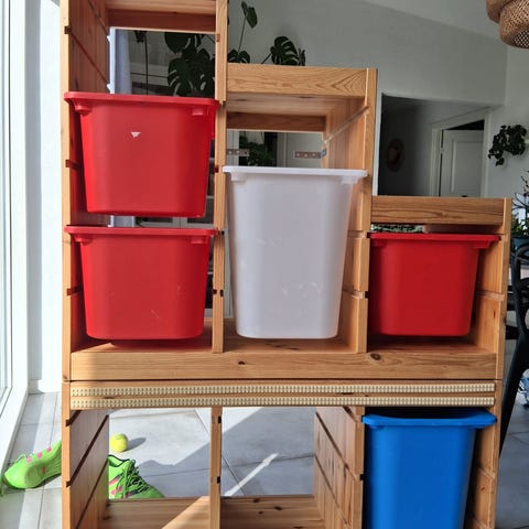IKEA legetøjsopbevaring med plastkasser i træ og flerfarvede beholdere. Reolen består af en træramme med flere rum, hvor der er indsatskasser i forskellige størrelser. Kasserne er i gul, orange og blå plast og kan tages ud efter behov. Egnet til opbevaring af legetøj, bøger og andre børneting på børneværelse eller i opholdsrum.