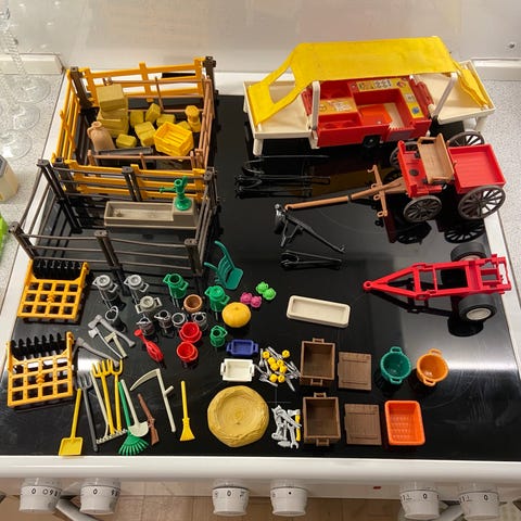 Lidt fra en rideskole i Playmobil. Tingene er i pæn stand. Der er heste, føl, hegn, kiste, katte, mm. Sender gerne.