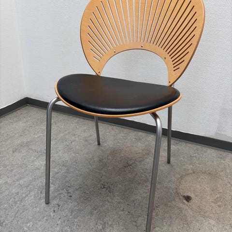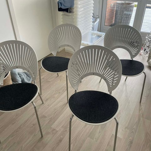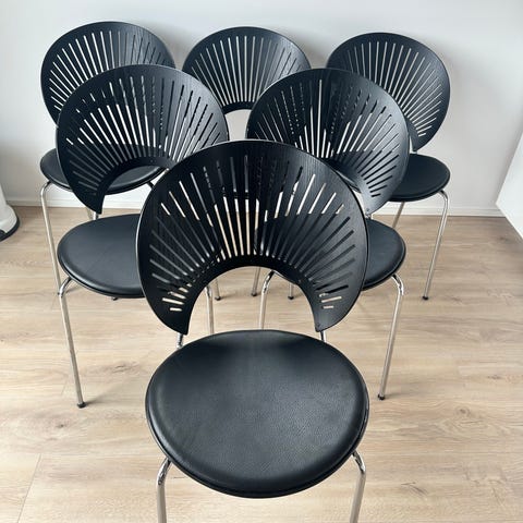 6 stk. Nanna Ditzel Trinidad stole. Hvidlakerede, matte stålben med originale drejelige stolefødder. Polstrede hynder i cognac farvet læder - uden pletter eller slid - medfølger. Stolene har små slidmærker, men er generelt i rigtig god stand.