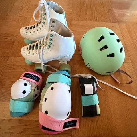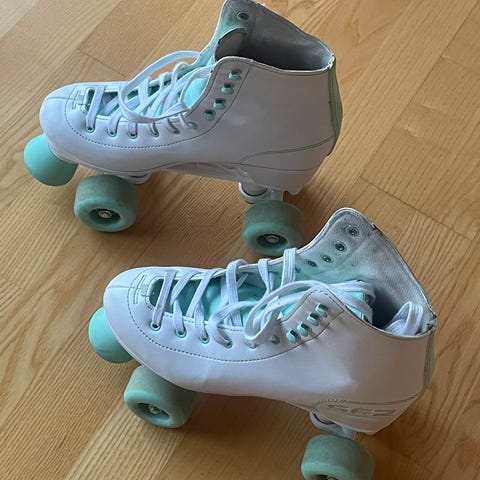 SFR rulleskøjter i klassisk side-by-side model. Rulleskøjterne er hvide med mintfarvede hjul og snørebåndslukning. Egnet til børn, størrelse one size. Velegnet til indendørs og udendørs rulleskøjteløb på glatte underlag.