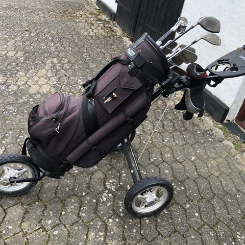 golfvogn med tilhørende golfbag og komplet jernsæt. Golfvognen er en elektrisk model med batteri og hjul, egnet til transport af bag og køller på banen. Golfbag i sort med gule detaljer, flere lommer og opdelte rum til køller. Sættet omfatter flere jernkøller samt en putter med headcover. Velegnet til brug på golfbanen for spillere, der ønsker en elektrisk vogn med bag og komplet jernsæt samlet. Mange andre sæt også. KOM MED ET SERIØST BUD