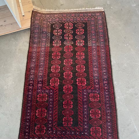 Ægte tæppe i rektangulær form med rødt og mørkt mønster. Tæppet har et klassisk orientalsk inspireret mønster med centrale medaljoner og kantbort med geometriske detaljer. Egnet til brug i gang, stue eller andre opholdsrum som gulvtæppe eller løber.