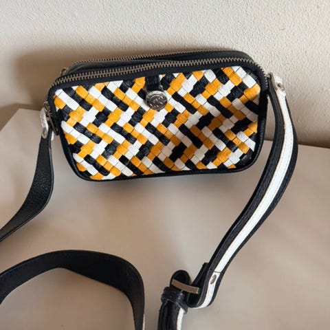 Marc Jacobs justerbar skulderrem med sølv hardware og i rigtig fin stand 👌🏻 Remmen har karabinhager med logo i metal i begge ender til fastgørelse på taske. Sort med gule bogstaver og sølv baggrund