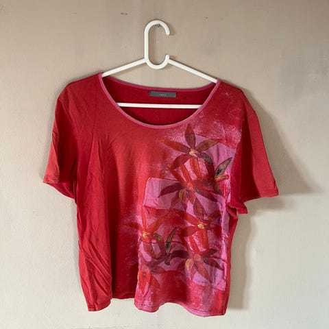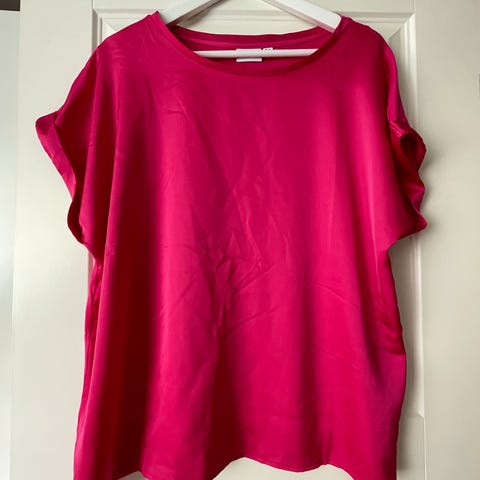 Bluse med rund hals, kort ærme, elastiksyning forneden på blusen.