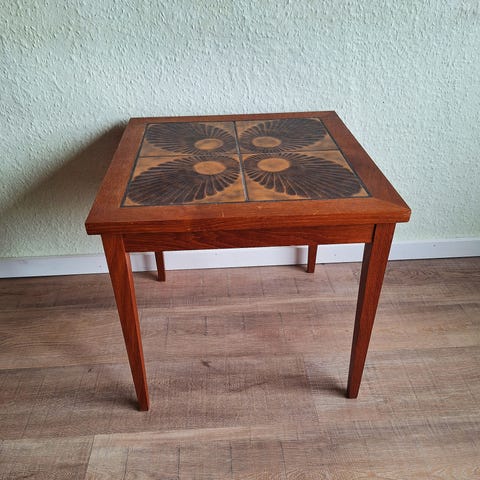 Klassisk side-/lampebord fra 1950’erne. Bordet er med karakteristiske bobbin-drejede ben (også kaldet kugleben) og bordpladen er prydet med keramiske fliser med blomstermotiver, alle i hel og meget fin stand. Hylde under bordet, som måler 45x45 cm.
