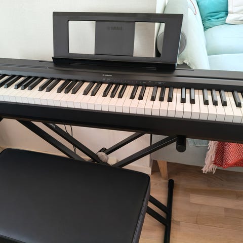 Der medfølger både pedal og klaverbænk, så du får en komplet pakke klar til brug.