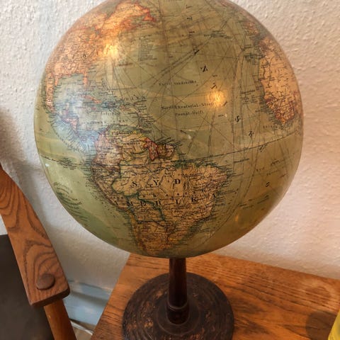 Antik Globus, Træ og papir, 95 år gl., Gammel Globus På Træ Sokkel