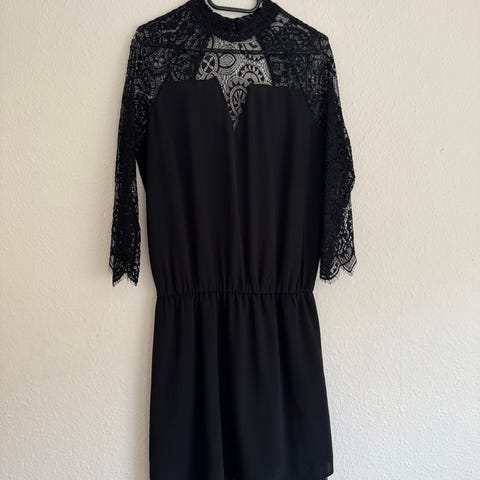 Smuk sort kjole med blondeærmer. Flot udskæring bag på. Lukkes i nakken med 2 knapper.