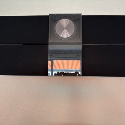 Stereo bænk / stand lavet i træ med grå folie og aluminium