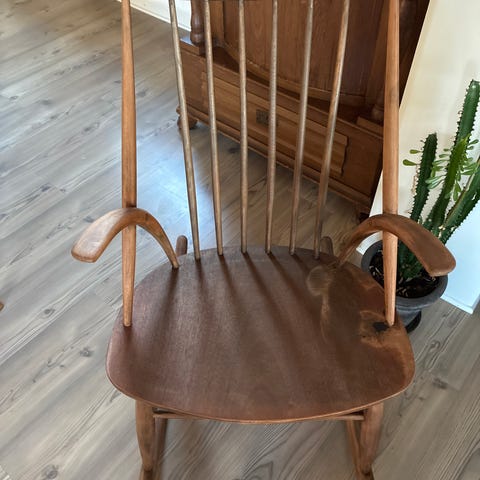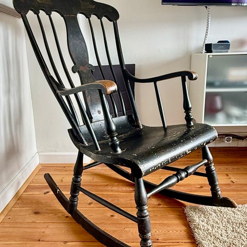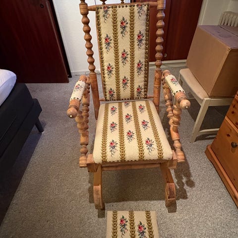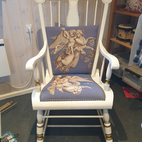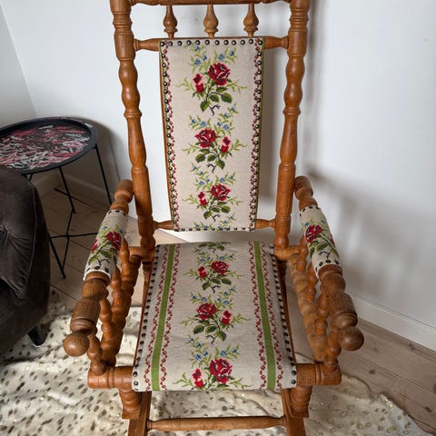 Gyngestol i træ med drejede ben og armlæn. Stellet er malet hvidt, og sæde samt høj ryg er polstret med kraftigt, mønstret stof i varme nuancer. Stoffet er fastgjort med dekorative møbelsøm langs kanterne. Egnet som siddeplads i stue, læsehjørne