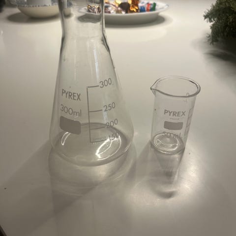 Pyrex laboratoriekolber i klart glas, herunder en Erlenmeyer-kolbe på ca. 100 ml med volumenmarkeringer. Sættet omfatter flere forskellige typer kolber og en høj, slank måle- eller reaktionskolbe, alle i gennemsigtigt laboratorieglas. Egnet til laboratoriebrug, undervisning eller som dekorative glasbeholdere.