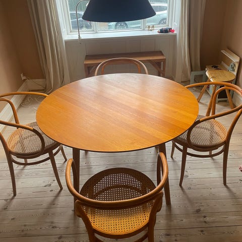 Robust rund spisebord i fyrretræ med udtræk, man kan evt. lave ekstra plader til😌