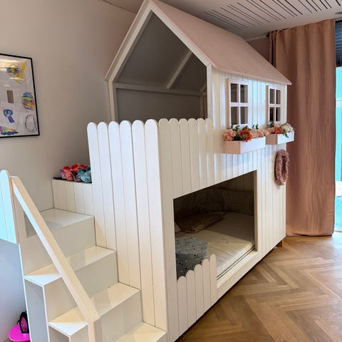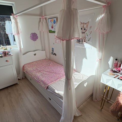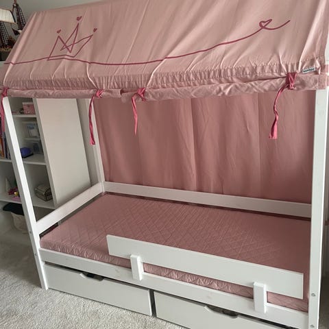 Husseng fra Hoppekids i hvid med smuk sengehimmel og diverse tilbehør. Passer perfekt til pigeværelset :-) Kun 1 år gammel. Meget pæn stand uden synlige brugstegn.