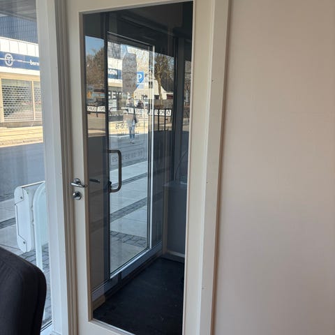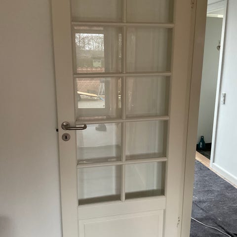 Indvendig glasdør med hvidmalet karm/ramme og sprosser. Døren har flere glasfelter, som giver lysgennemgang mellem rum. Bredde er målt til omkring 80 cm. Velegnet som indvendig dør i bolig, kontor eller lignende, hvor der ønskes visuel kontakt og lys mellem rum.
